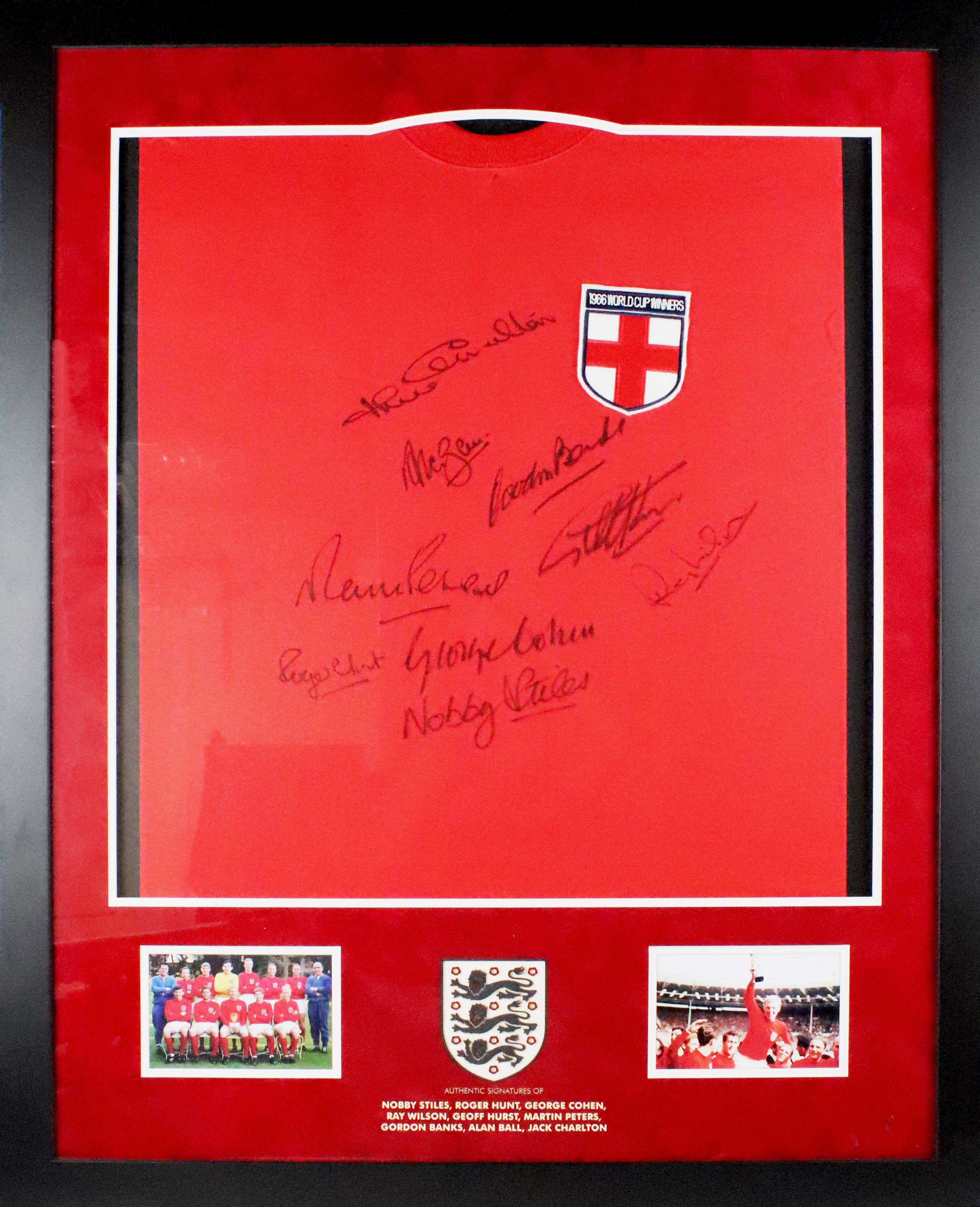 £799.00 GBP£799.00 GBP/This fantastic Shirt display was hand-signed by 1966 FIFA World Cup winners Nobby Stiles, Roger Hunt, George Cohen, Ray Wilson, Geoff Hurst, Martin Peters, Gordon Banks, Alan Ball, Jack...