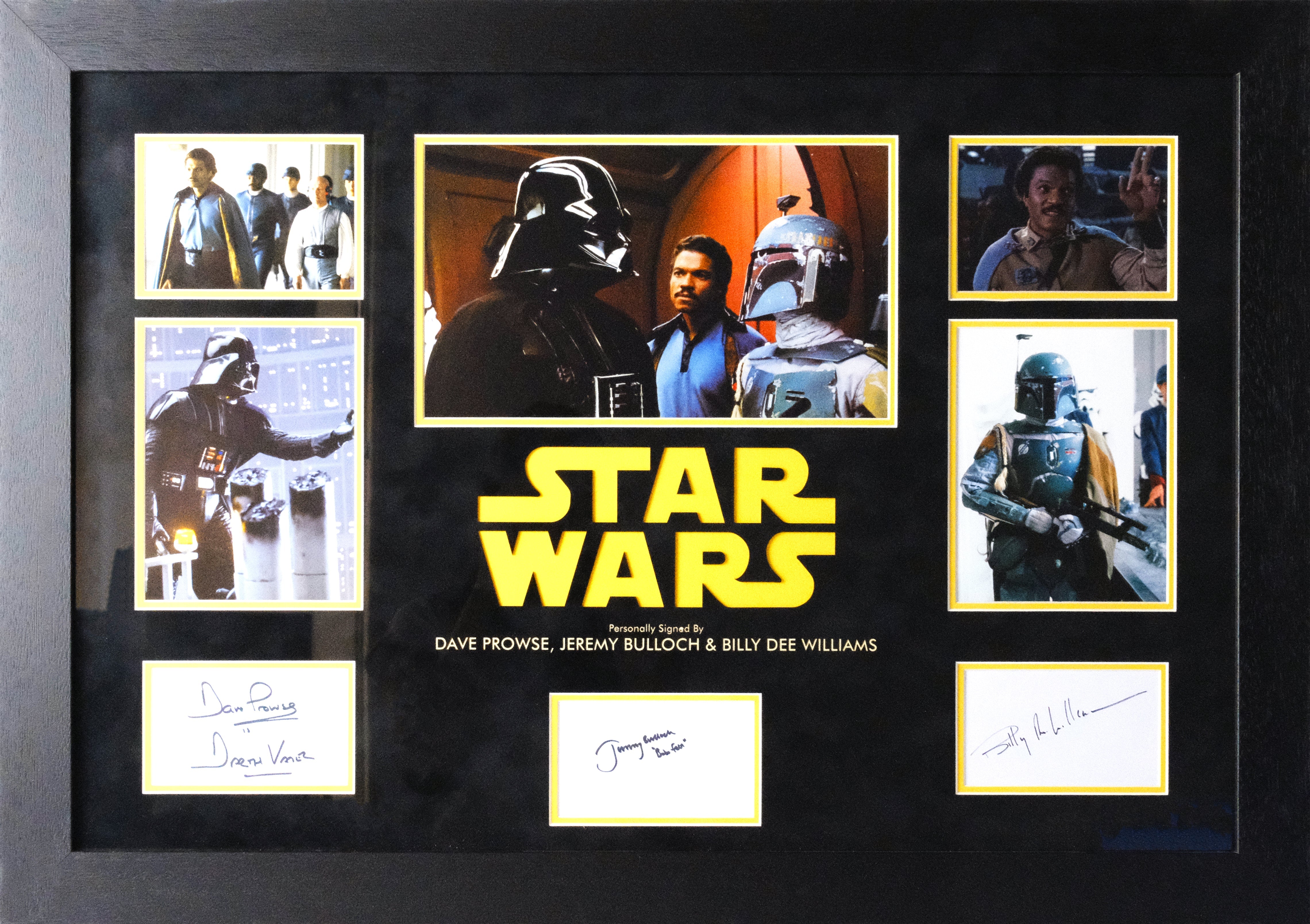 £599.00 GBP£599.00 GBP/This fantastic white card display was hand-signed during a professional closed signing session by Dave Filoni, Jeremy Bulloch and Billy Dee Williams. Framed by our in house framing...
