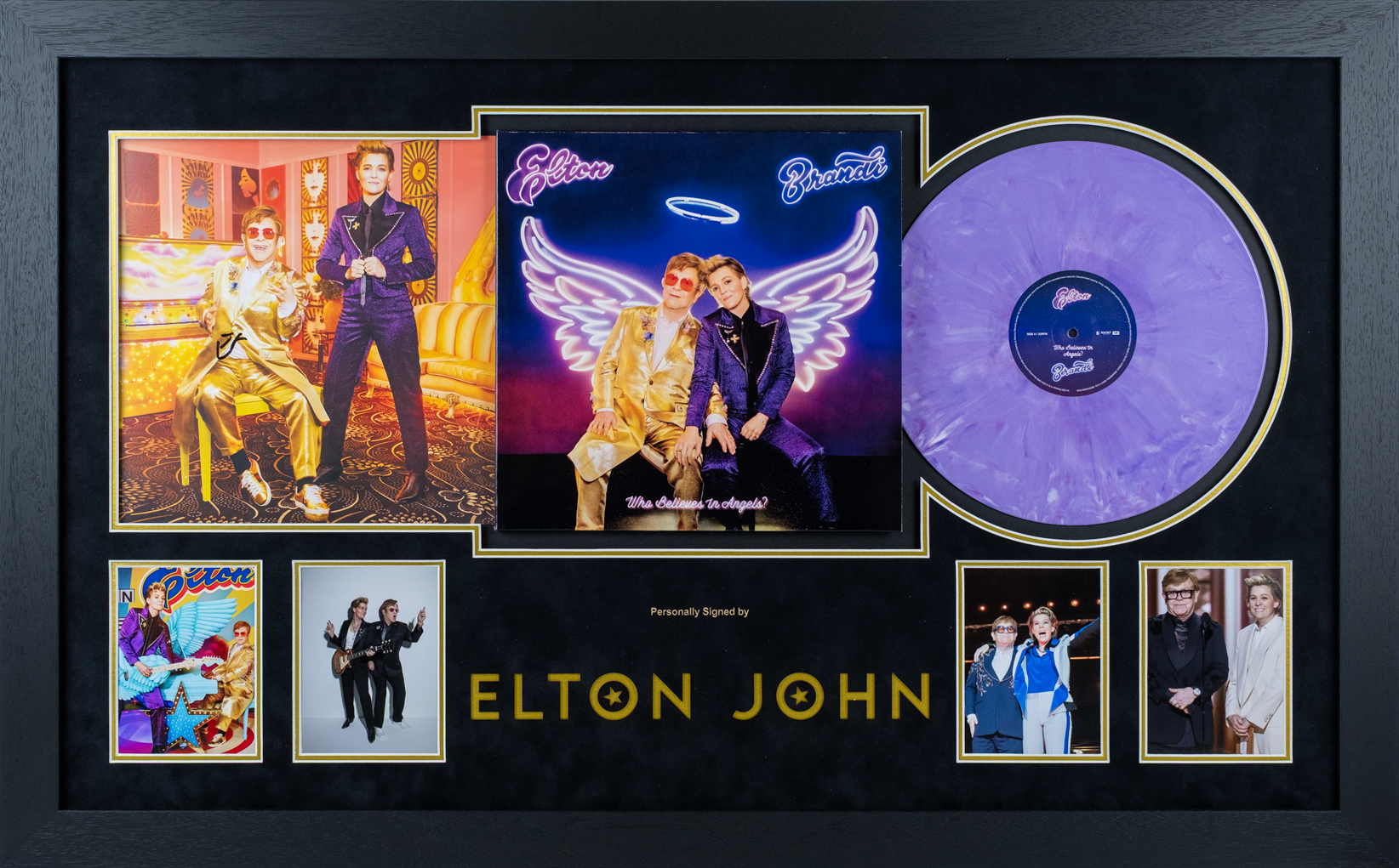 Elton john signed 'who believes in angels?' vinyl insert framed display