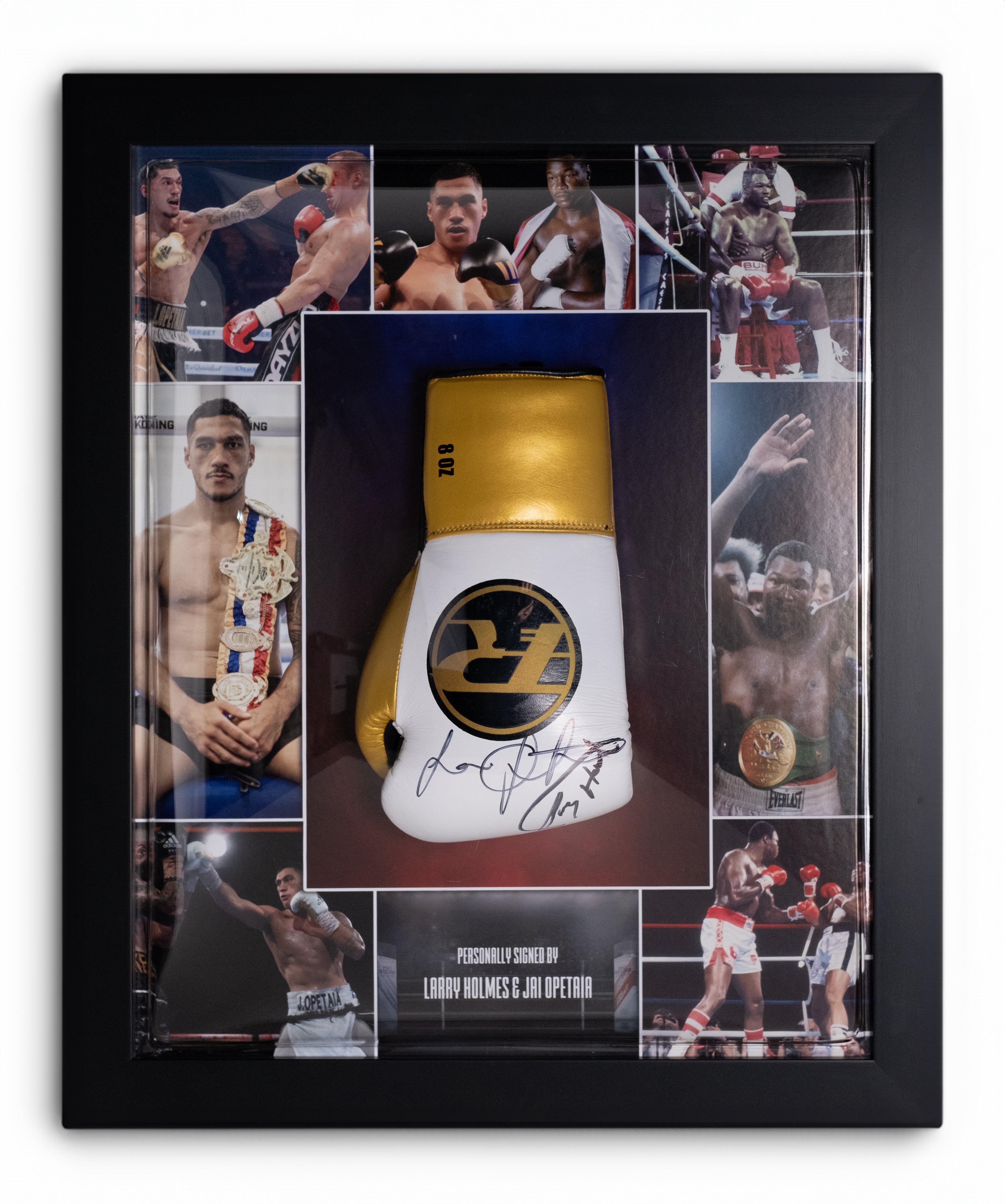 Larry holmes & jai opetatai signed glove framed display