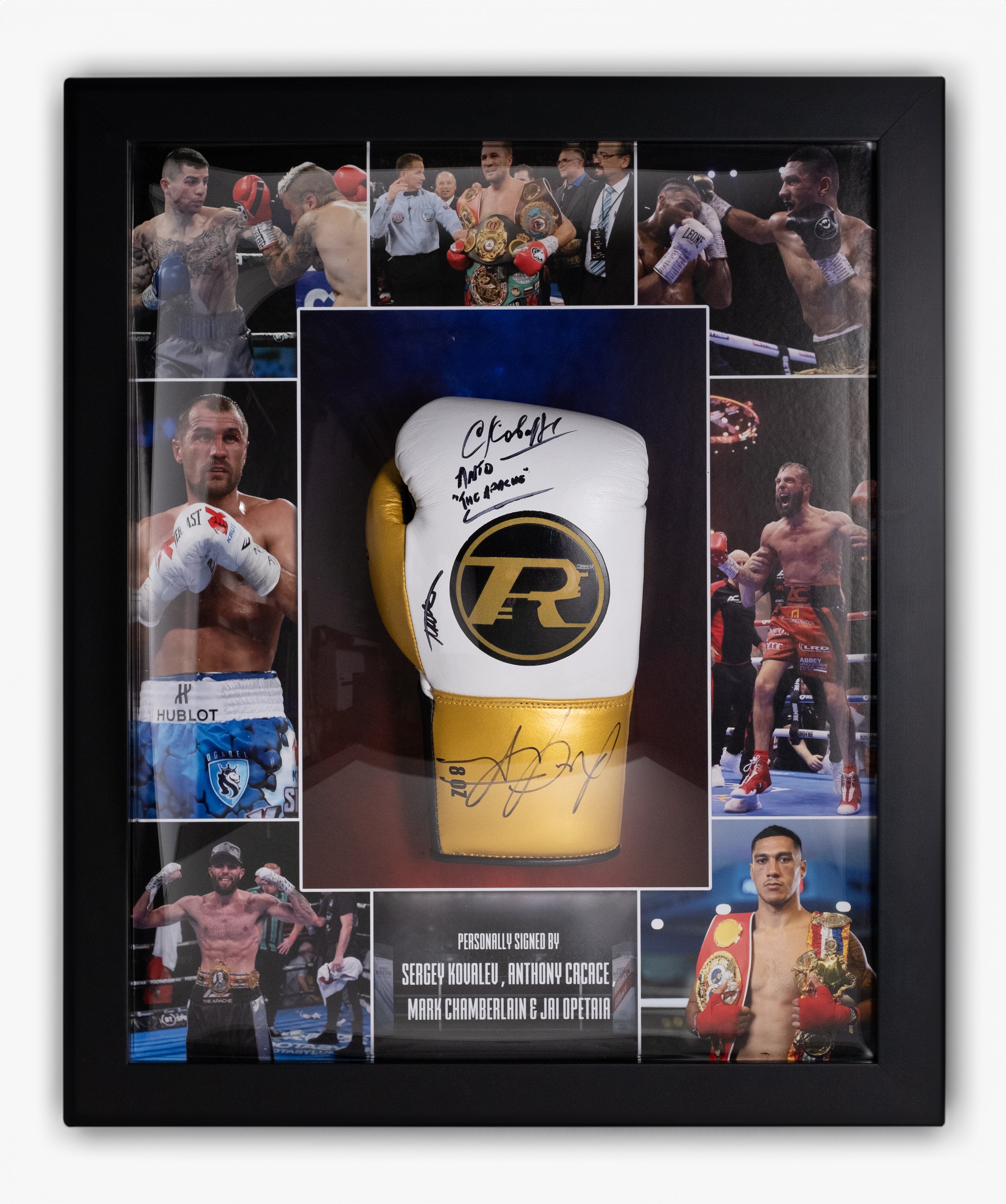 Kovalev, cacace, chamberlain & opetaia signed glove framed display